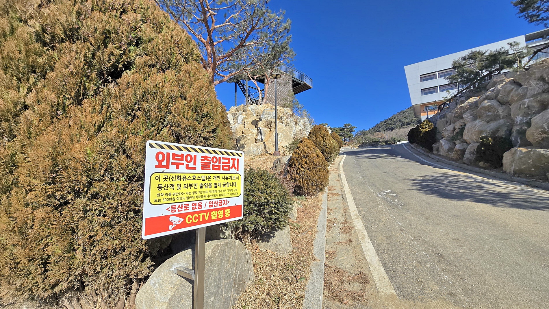 ▼ 신화유스호스텔 : 외부인 출금 안내판이 설치되어 있어 좌측으로 진행해 보았으나 정면돌파 외에 뾰족한 수가 없는 듯하고