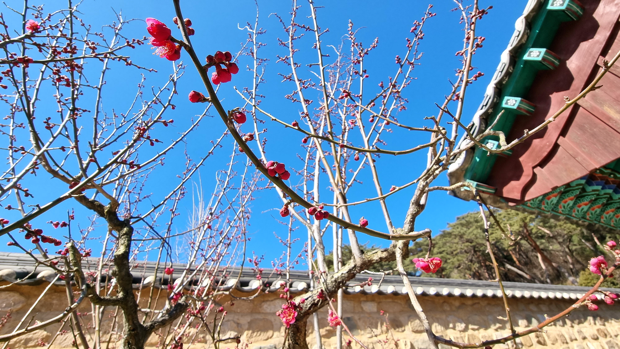 ▼ 통도사 홍매화, 추위 영향으로 개화가 늦고