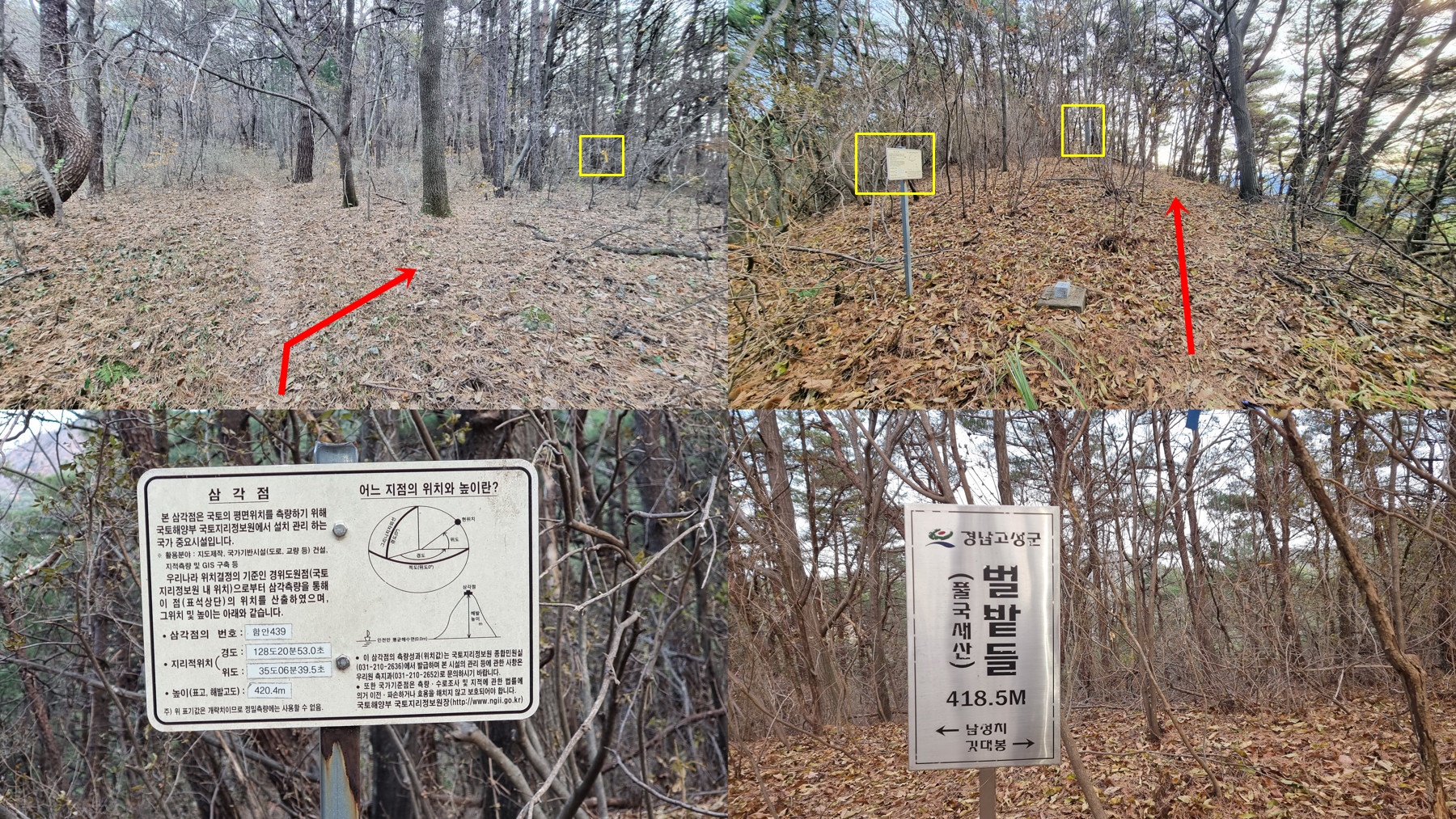 ▼직진하는 좋은 길 버리고 산행표지기를 살펴 우틀하여 삼각점이 위치한 벌밭들에 이르고