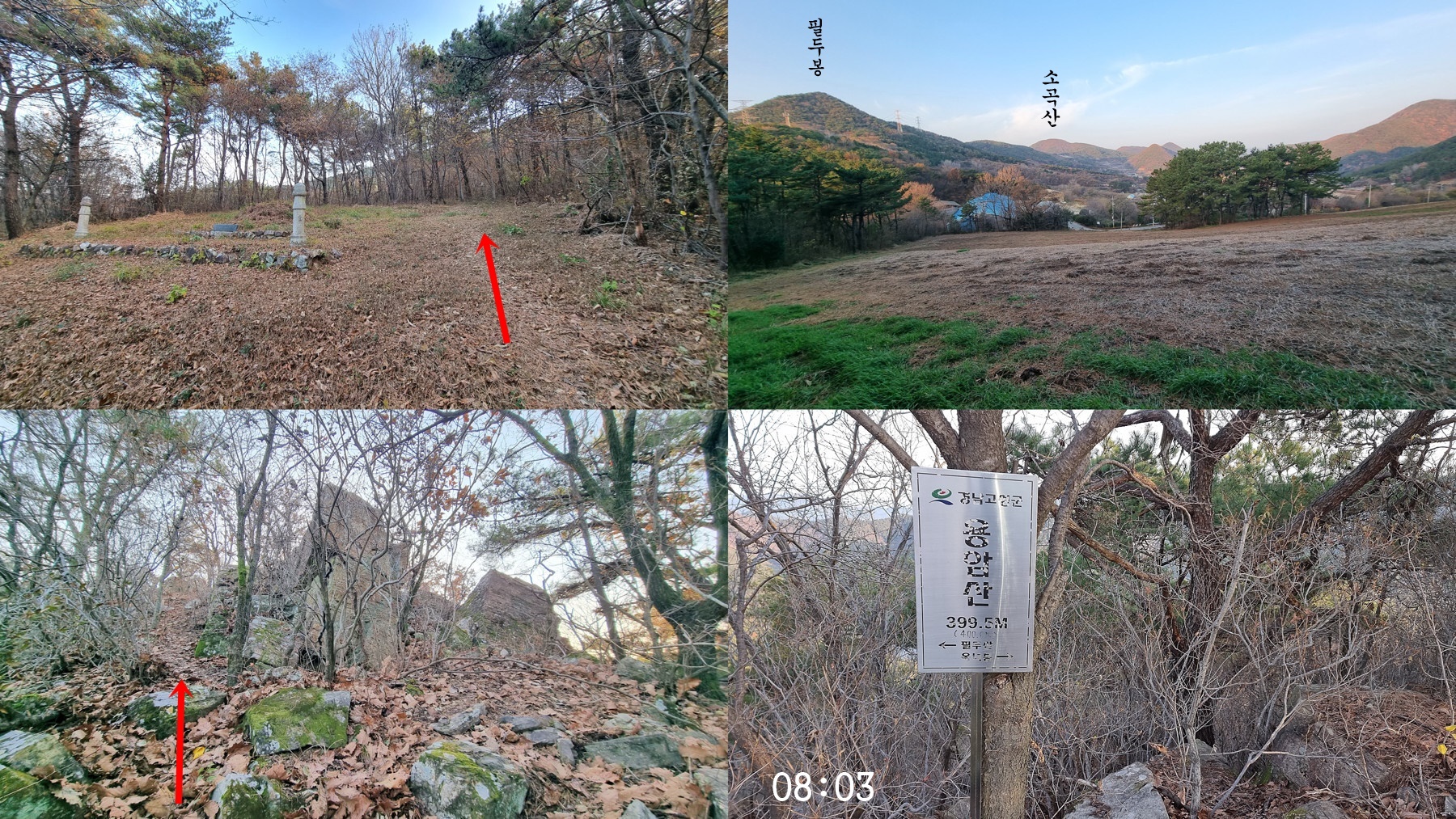 ▼ 묘지 지나 좌측 밭자리에서 지나 온 필두봉을 조망 후 용암산에 이르고, 출발지에서 1시간 23분 소요