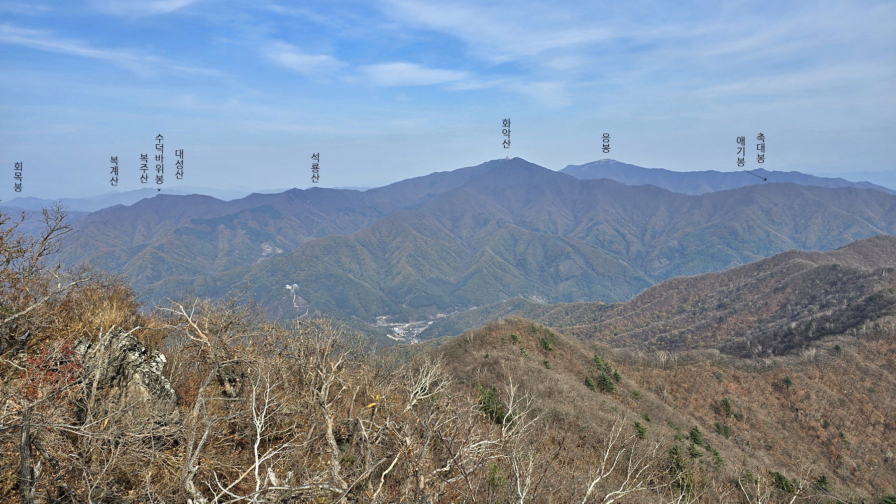 ▲ 명지3봉에서 본 연인산과 주변 능선. 명지 3봉이 1,210m에 이르는데다 연인산과 아재비고개로 가깝게 맞닿아 있기 때문에 연인산 전체가 발 밑에 보인다. 하지만 연인산은 해발이 1,068m로 경기도 내에선 매우 높은 산이다.