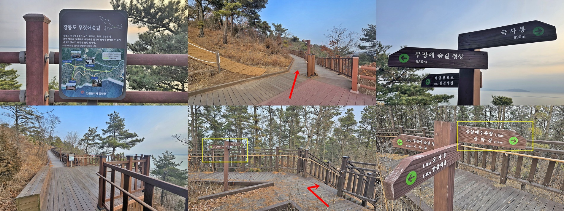4. 코스 : 건어장 종점~윤옥(유노)골 해변~쪽쪽골 해변~습곡구조 해변(가칭)~봉화대~팔각정자~국사봉~말문고개~장봉도무장애숲길~구름다리~인천둘레길16코스~상산~장봉선착장
