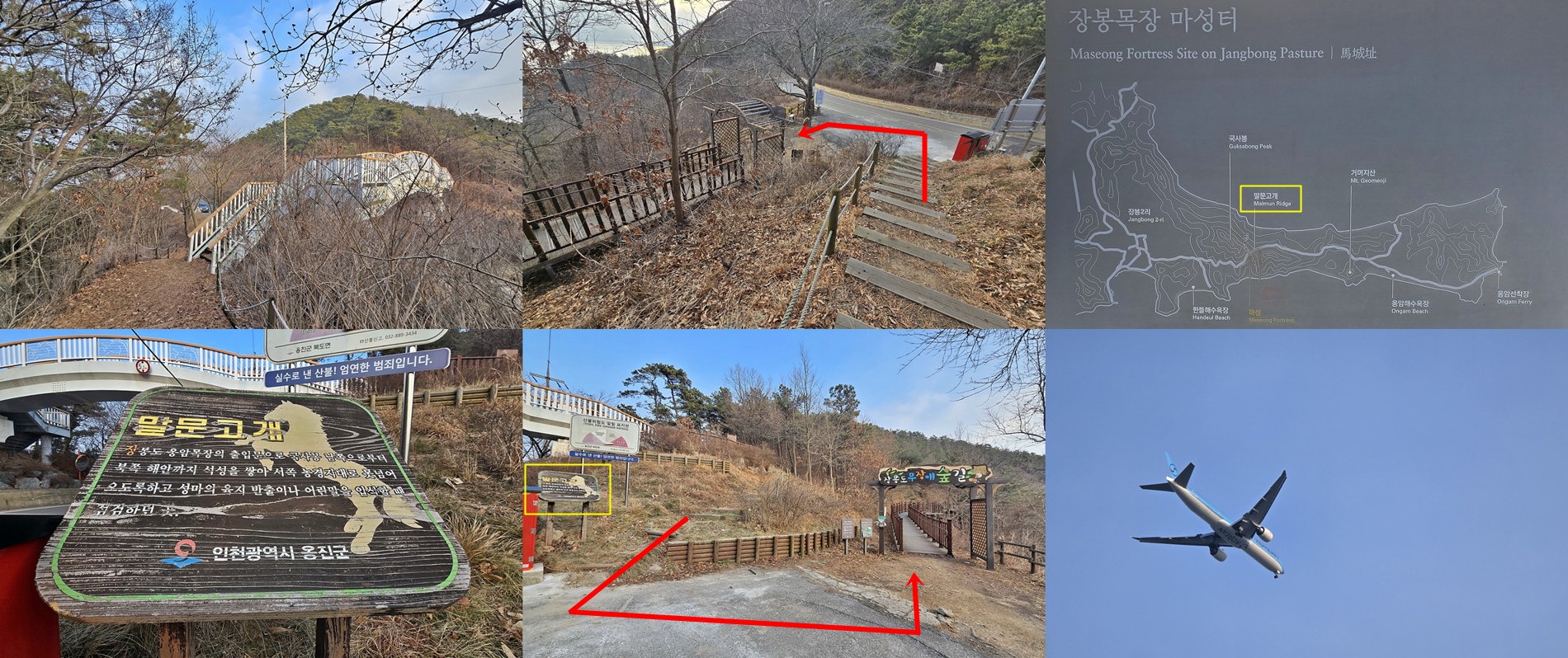 ▼ 말문고개 : 무장애숲길로 진행, 인공공항으로 하강하는 대한항공 여객기를 담아보고