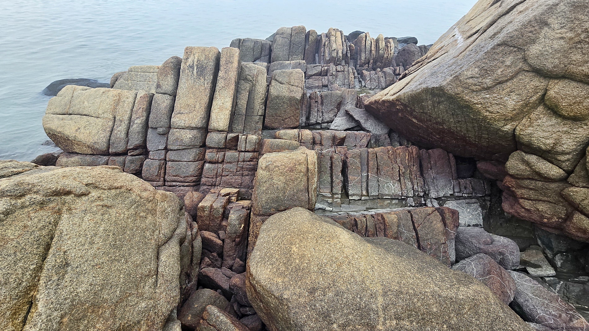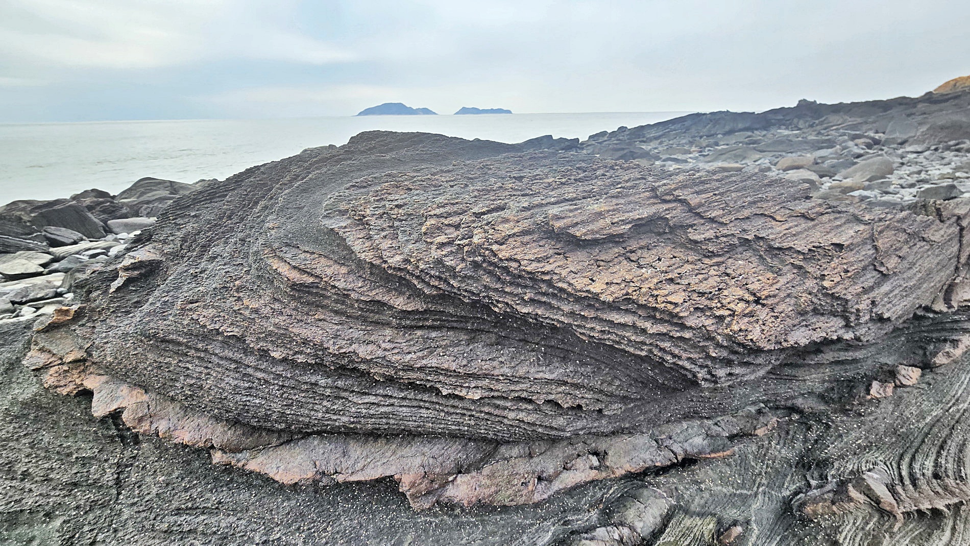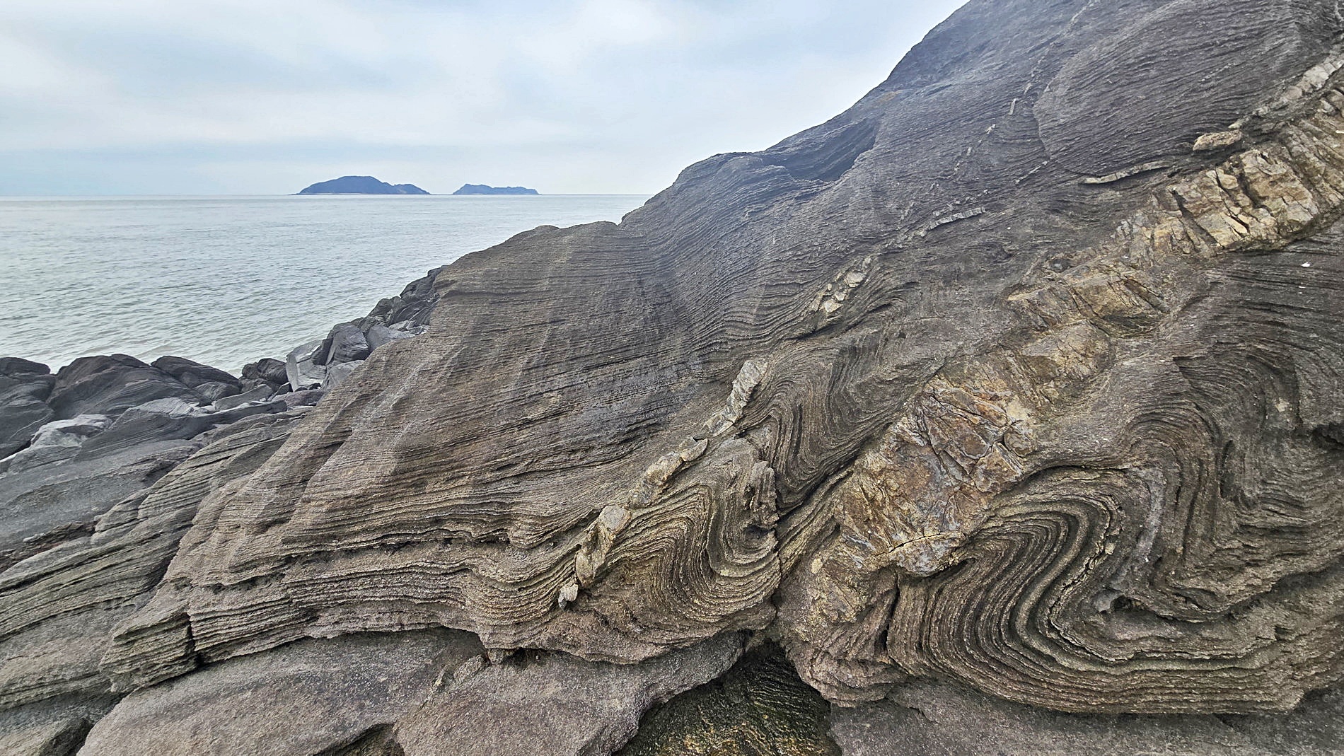첫째는 단면의 지층면 형태가 불규칙한 습곡이다. 온도나 압력이 매우 높은 지하 깊은 곳에서 생성된 것으로 암석의 유동이 고찰된다. 이는 물엿 표면에 잉크로 주름을 그렸다가 휘저을 때 생기는 무늬와 비슷하다.[1]