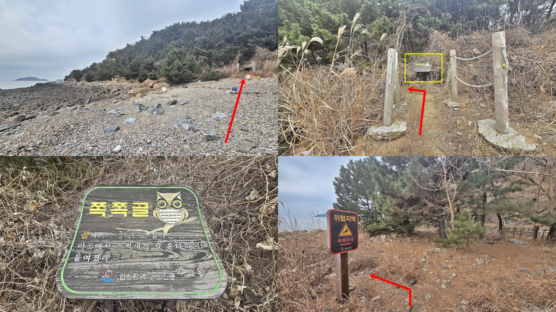 ▼ 쪽쪽골 해변에서 잠시 숲길로 복귀하였다가 위험지역 표지 있는 곳에서 좌틀하여 다시 해변으로