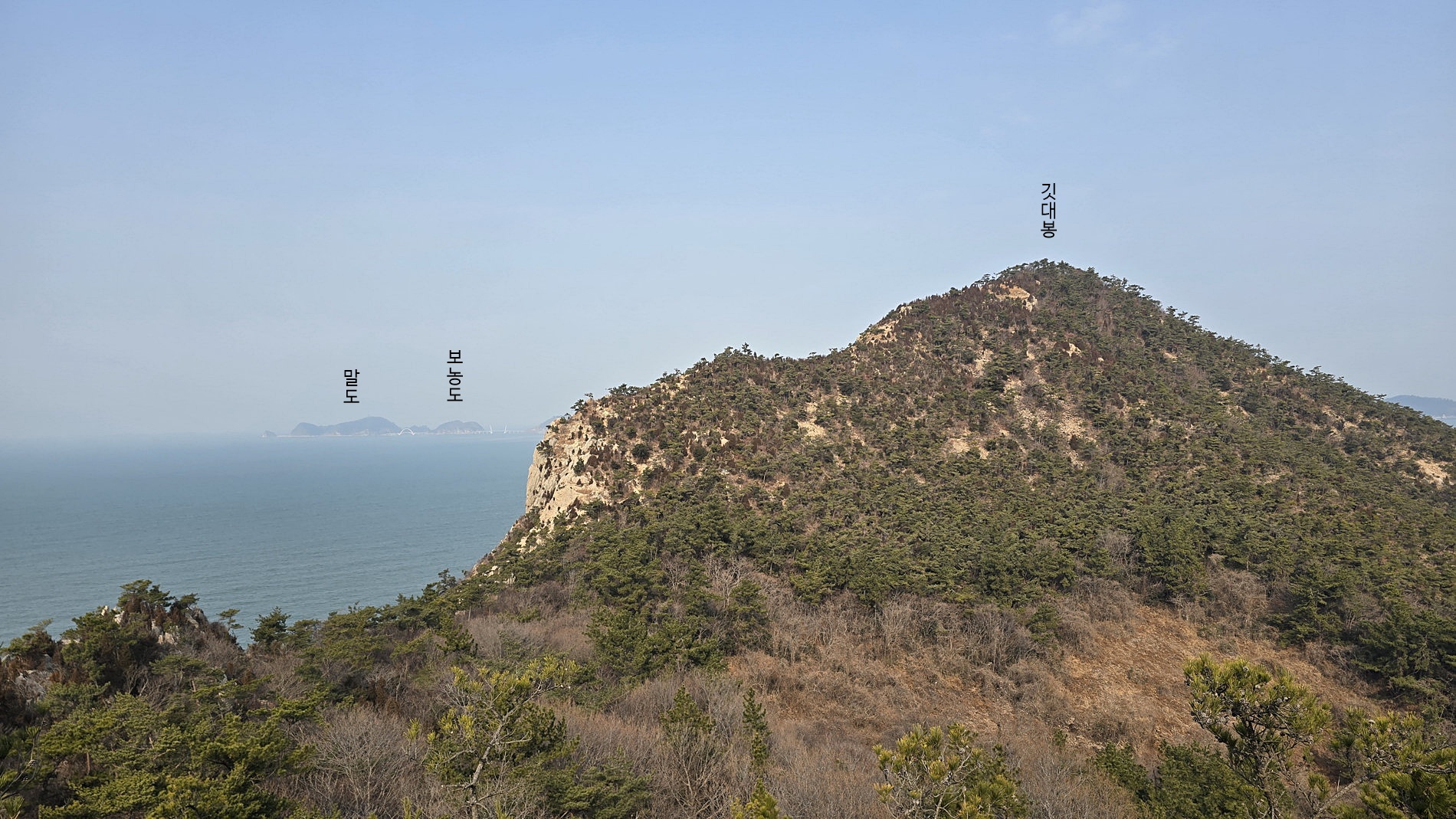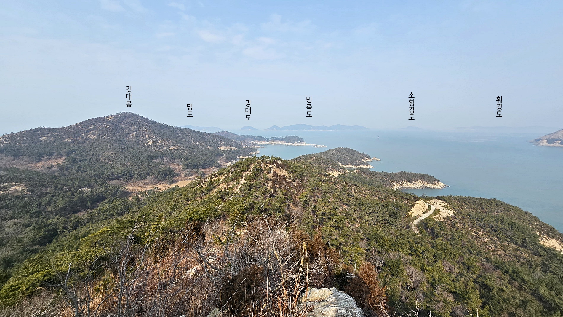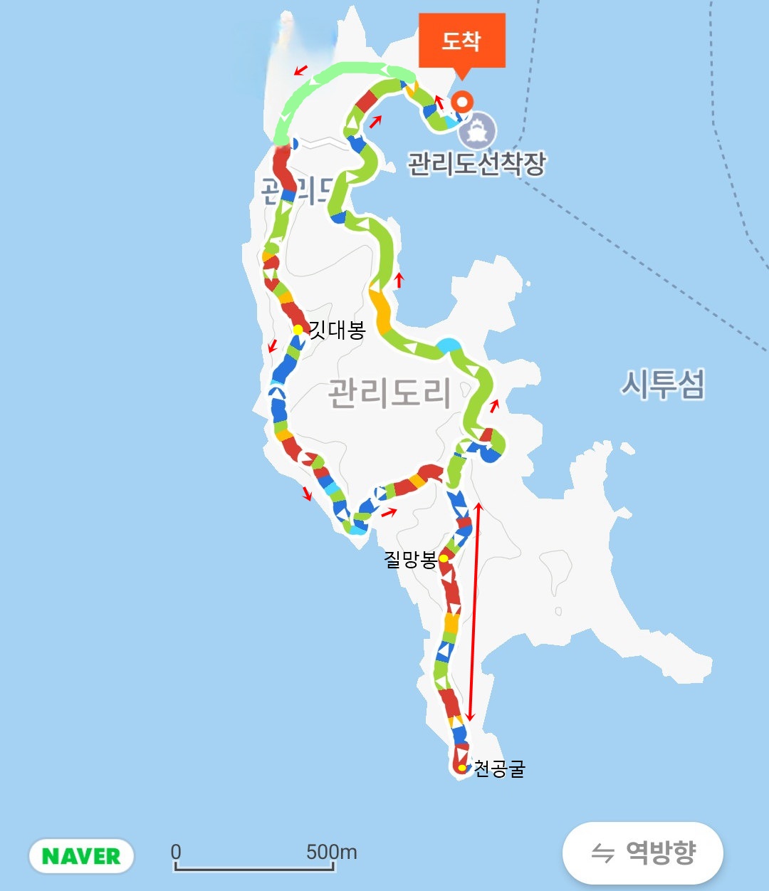 4. 코스 : 관리도선착장~발전소~작은깃대봉(전망데크)~낙조(팔각정)전망대~용바위/캠핑장~전망데크~깃대봉~갈림1~갈림2~질망봉(129봉), 쇠코바위(천공굴) 왕복~마을길~관리도선착장