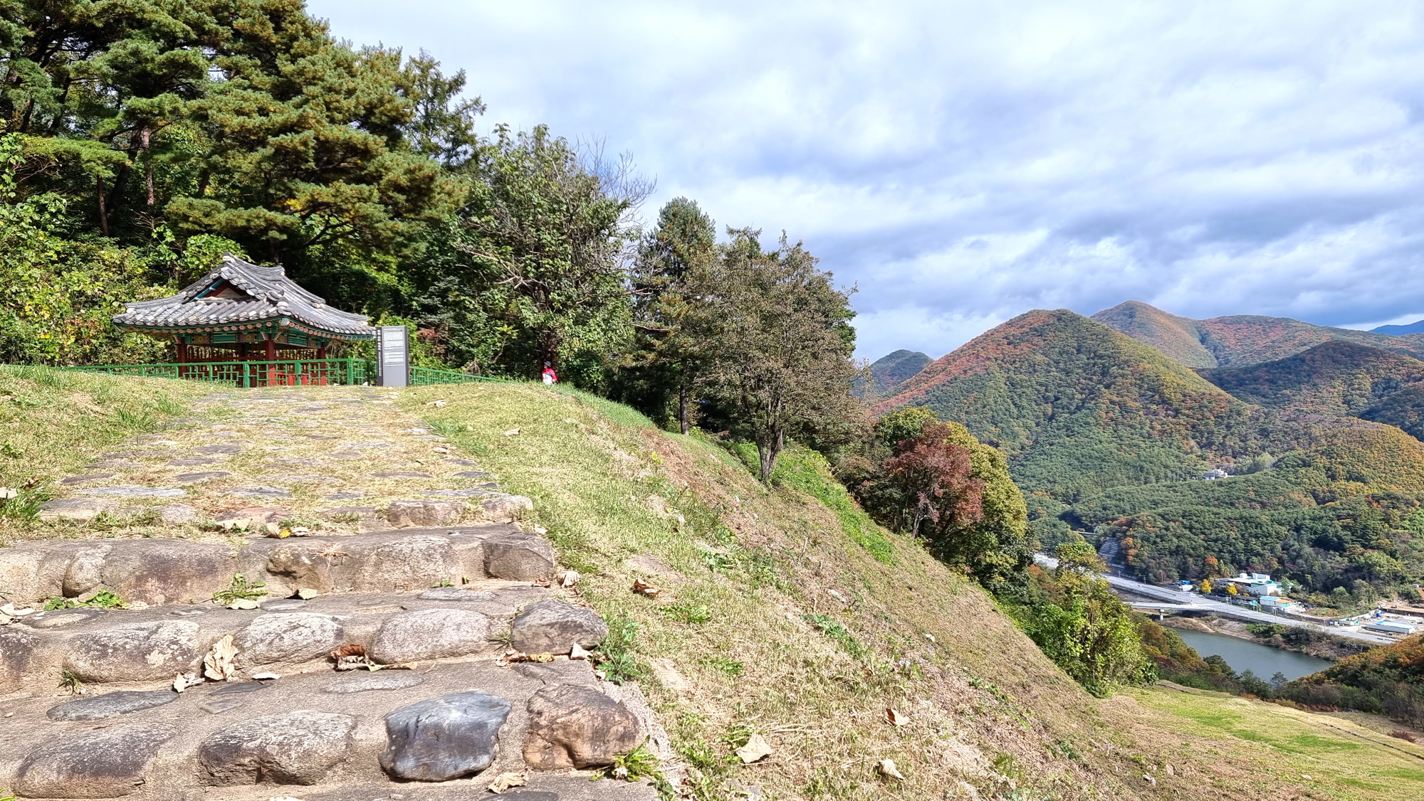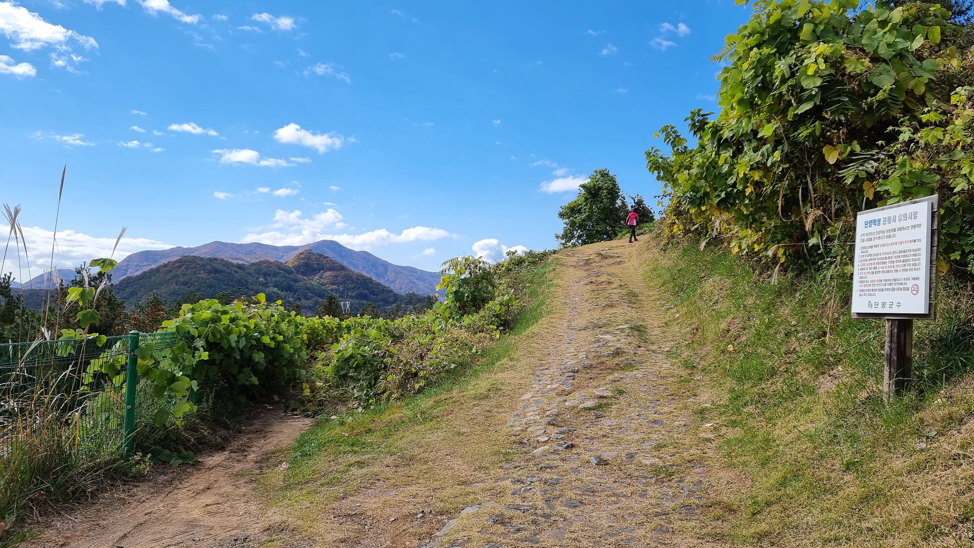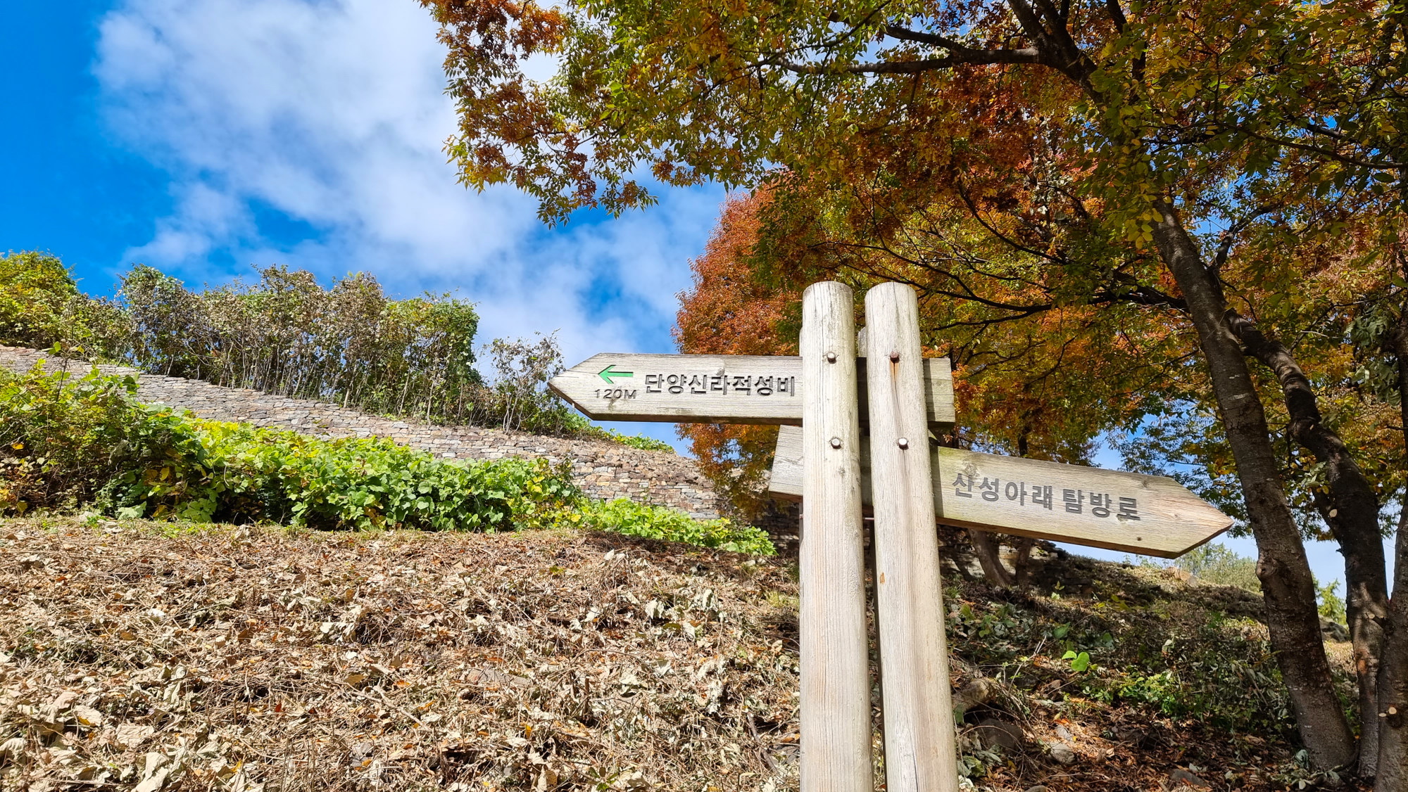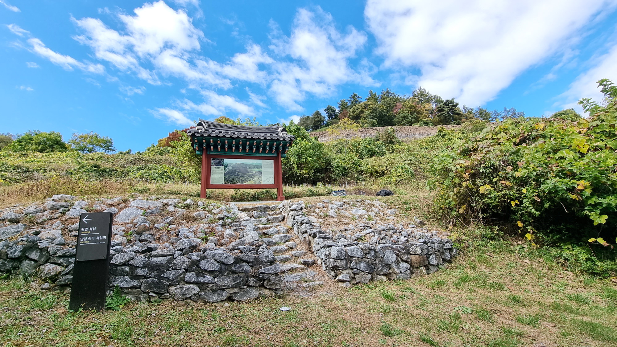 4. 코스 : 주차장( 단양군 단성면 하방리 52 / 중앙고속도로 단양팔경휴게소 춘천방향 인접)~도로갈림길 좌틀~철망펜스따라 가다 갈림길에서 우틀, 이정목(단양신라적성비 방향)~비각~능선삼거리 쉼터에서 사각정자 왕복 후 적성산성 방향으로~적성산성~복원 끝지점에서 평탄한 길~적성안내표지~주차장