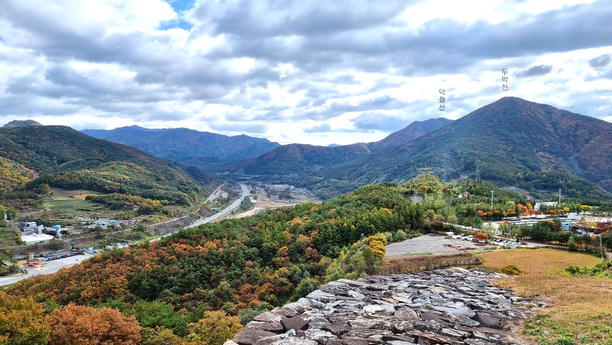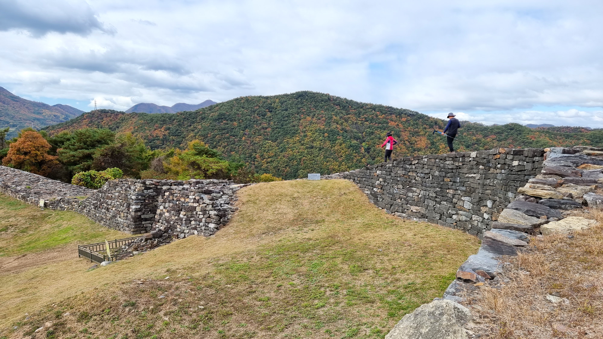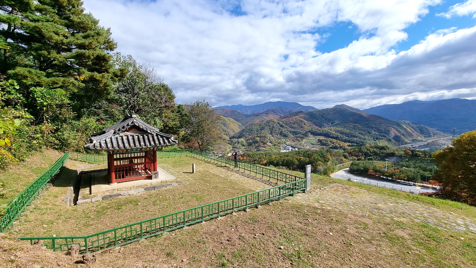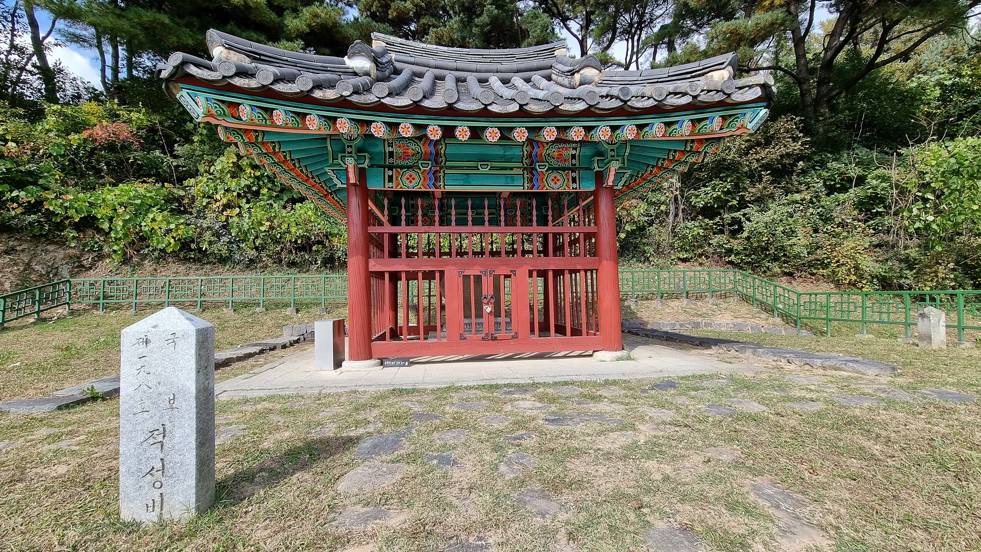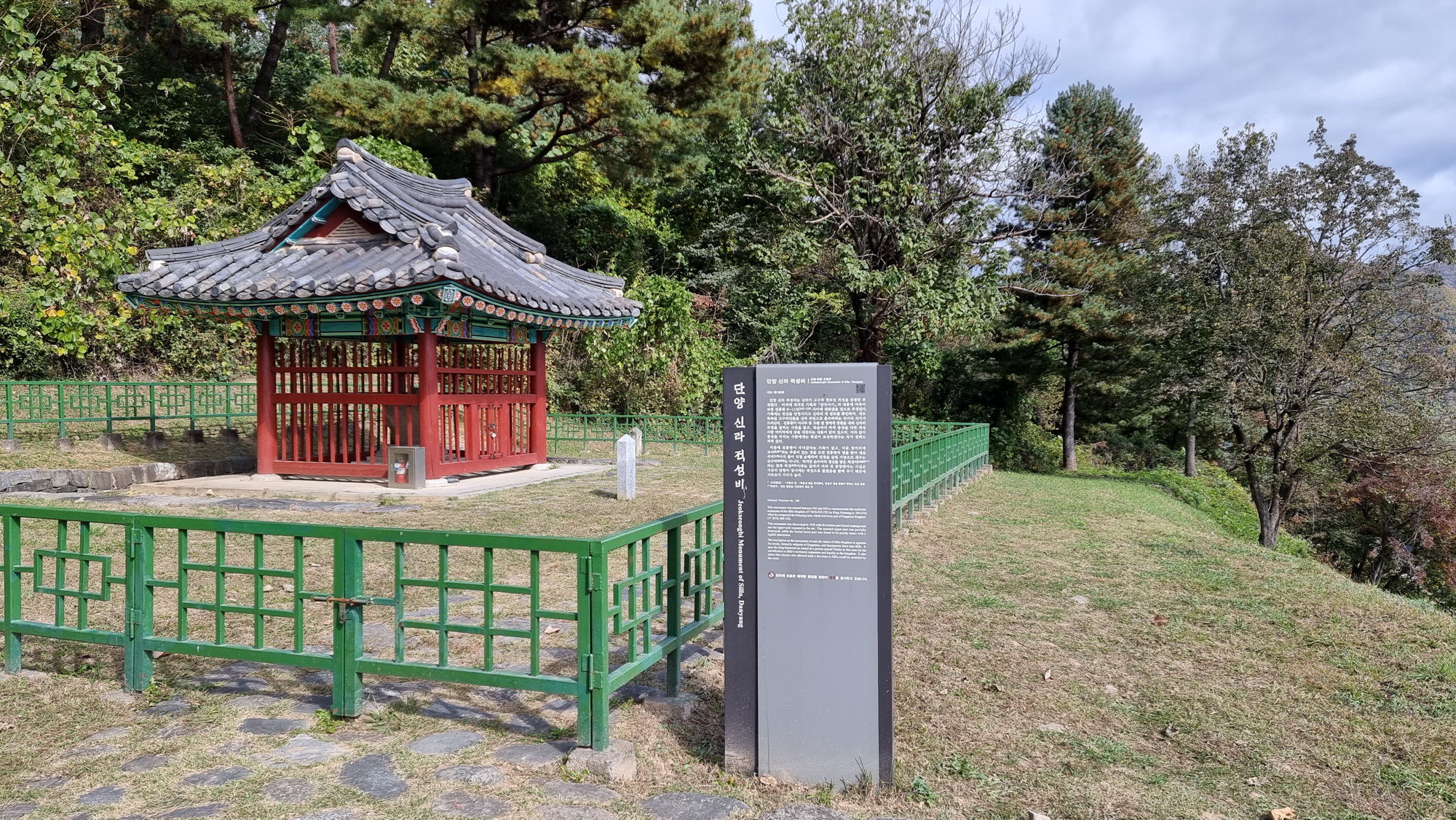 4. 코스 : 주차장( 단양군 단성면 하방리 52 / 중앙고속도로 단양팔경휴게소 춘천방향 인접)~도로갈림길 좌틀~철망펜스따라 가다 갈림길에서 우틀, 이정목(단양신라적성비 방향)~비각~능선삼거리 쉼터에서 사각정자 왕복 후 적성산성 방향으로~적성산성~복원 끝지점에서 평탄한 길~적성안내표지~주차장