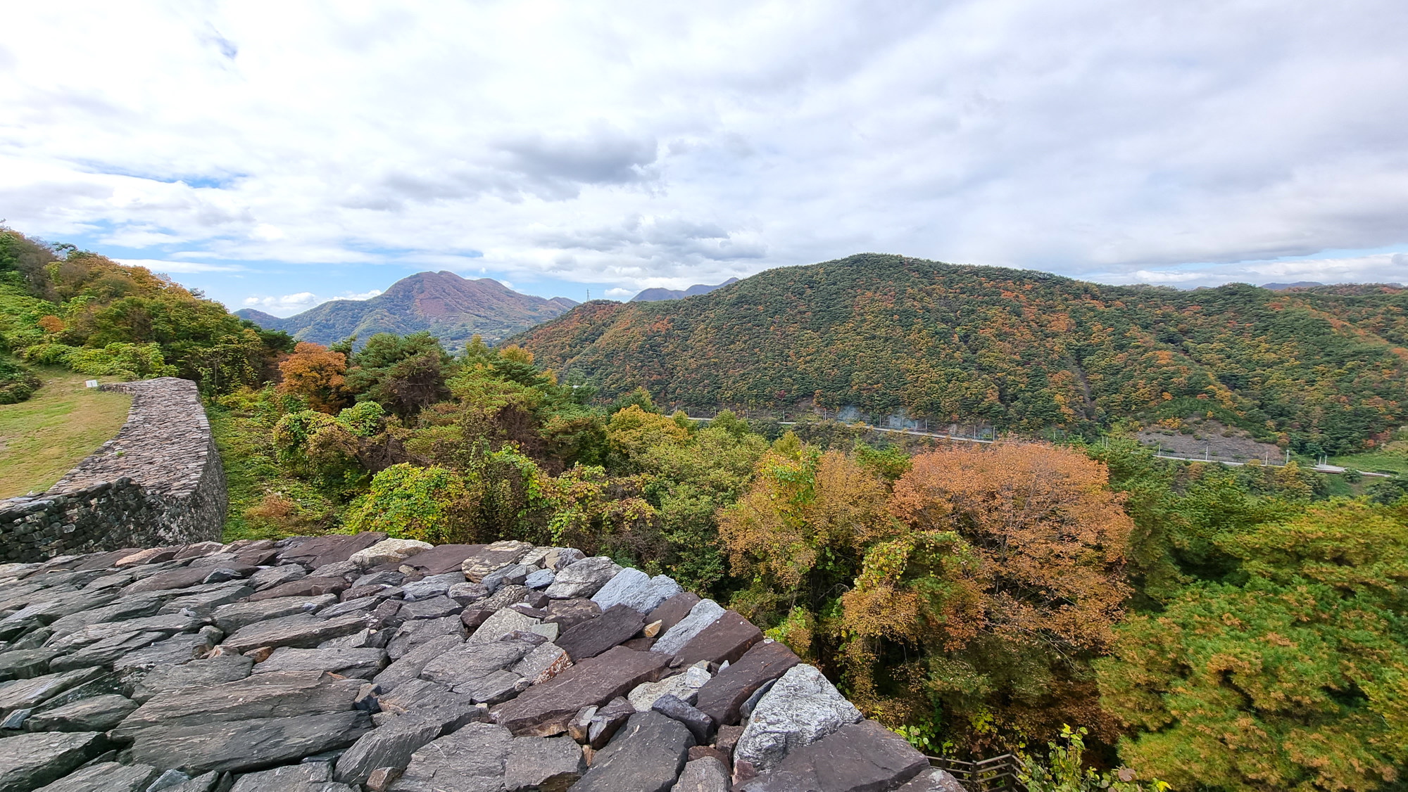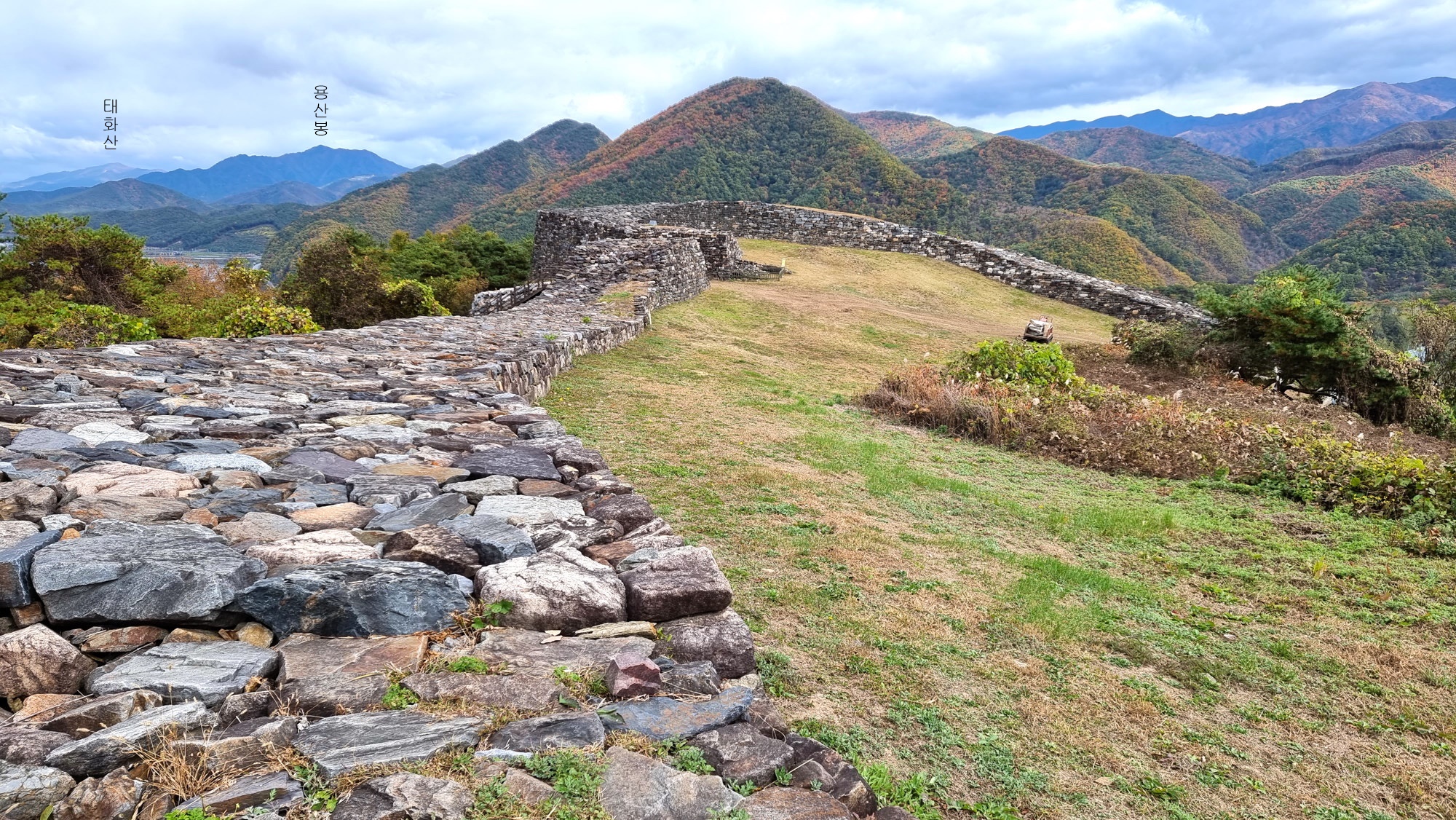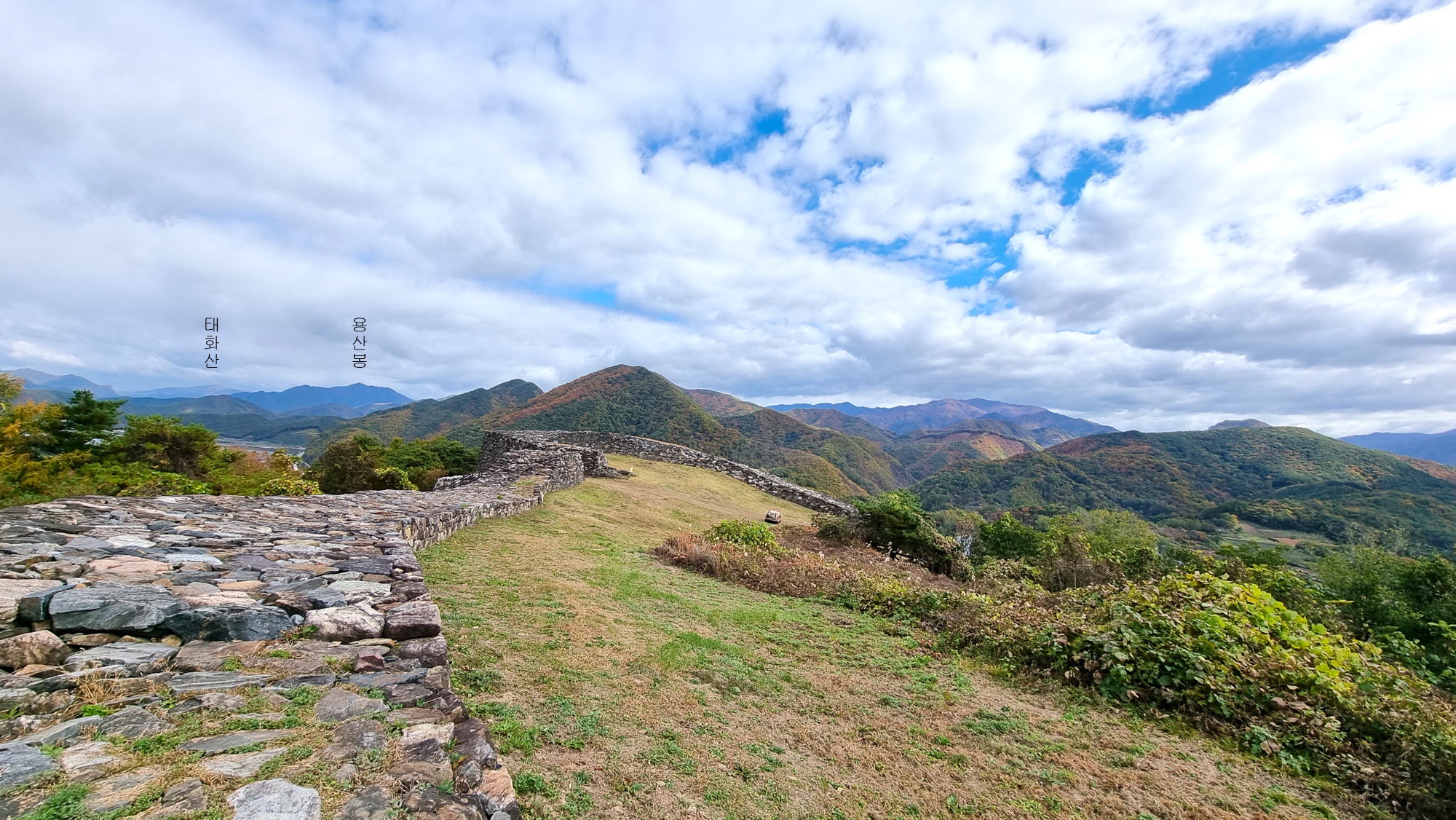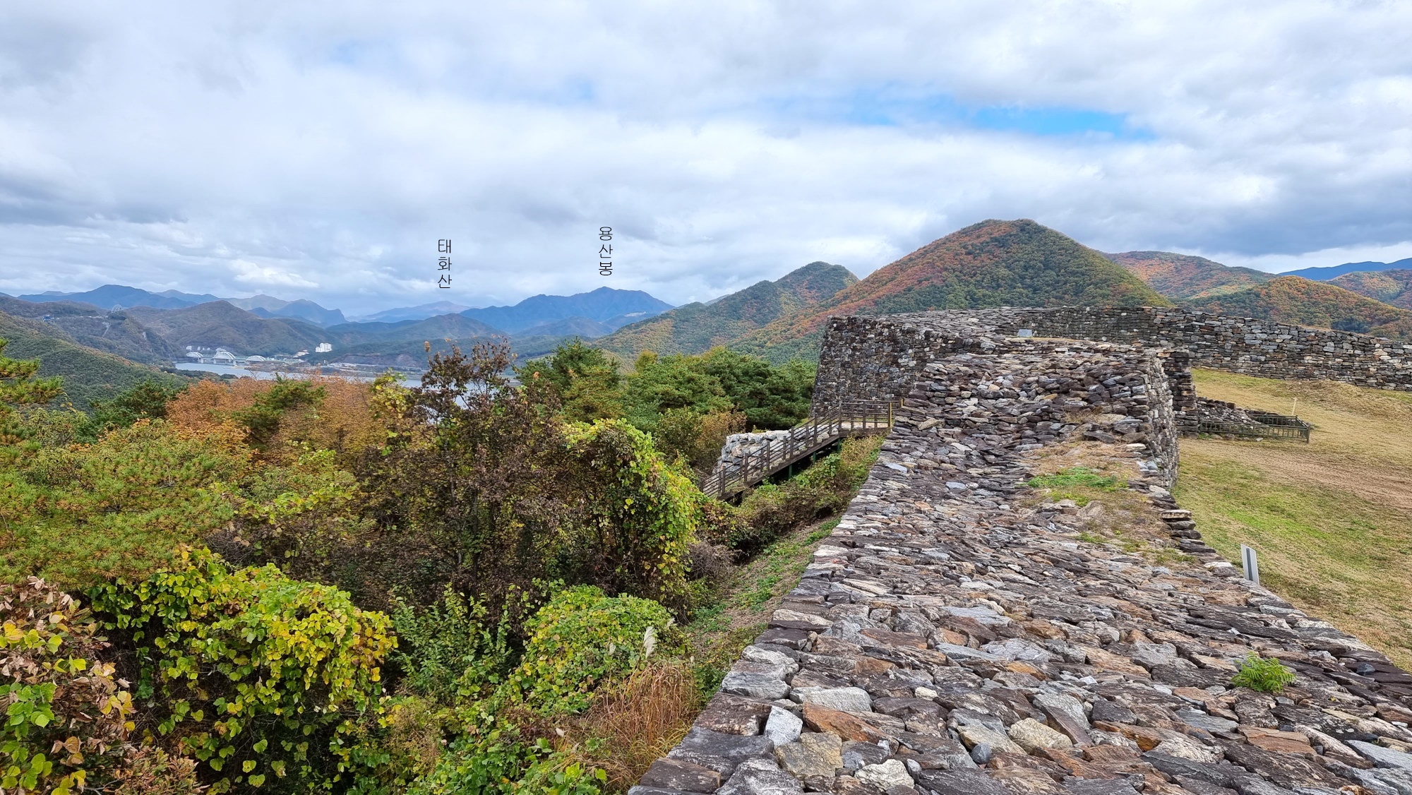 4. 코스 : 주차장( 단양군 단성면 하방리 52 / 중앙고속도로 단양팔경휴게소 춘천방향 인접)~도로갈림길 좌틀~철망펜스따라 가다 갈림길에서 우틀, 이정목(단양신라적성비 방향)~비각~능선삼거리 쉼터에서 사각정자 왕복 후 적성산성 방향으로~적성산성~복원 끝지점에서 평탄한 길~적성안내표지~주차장