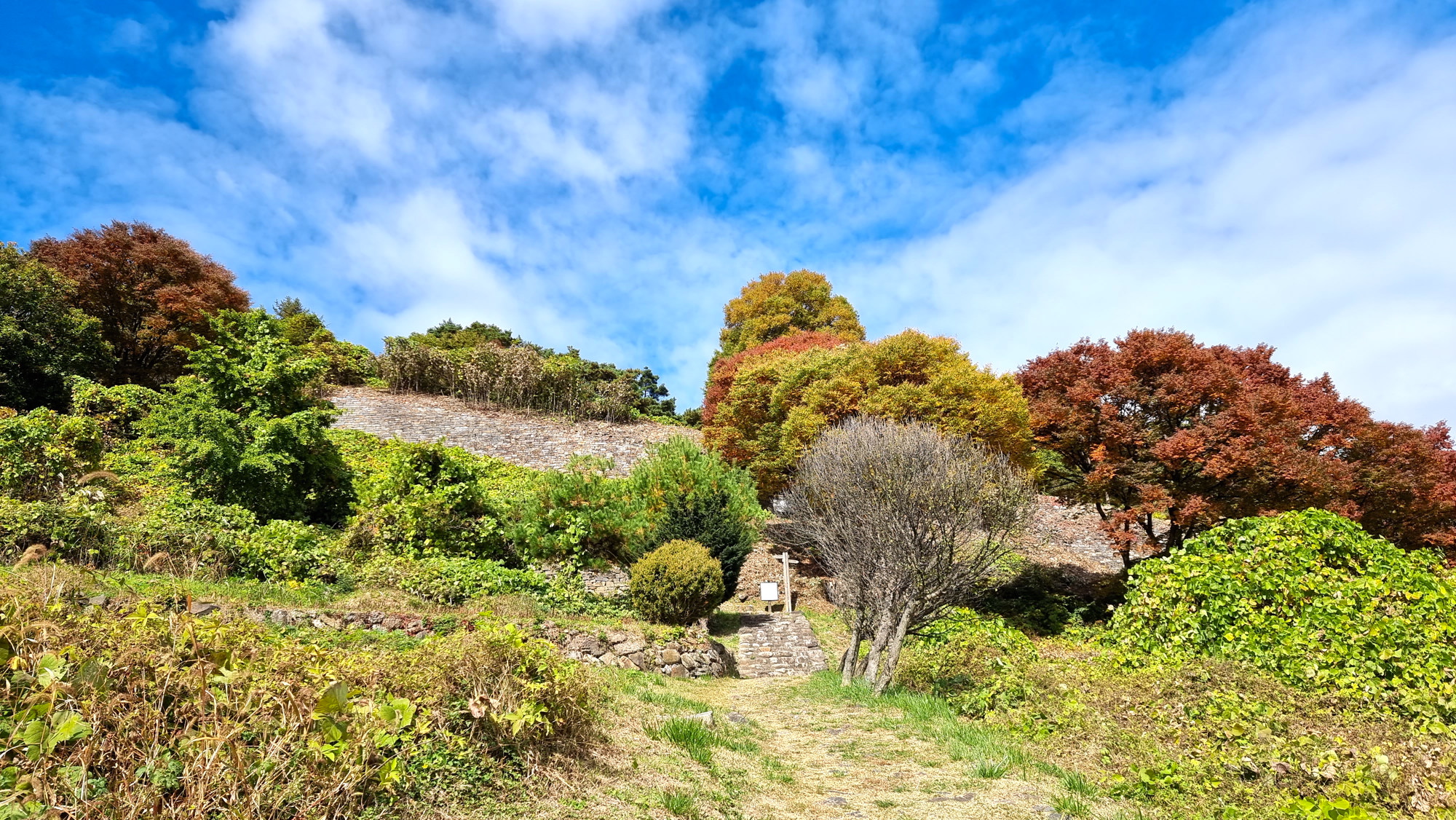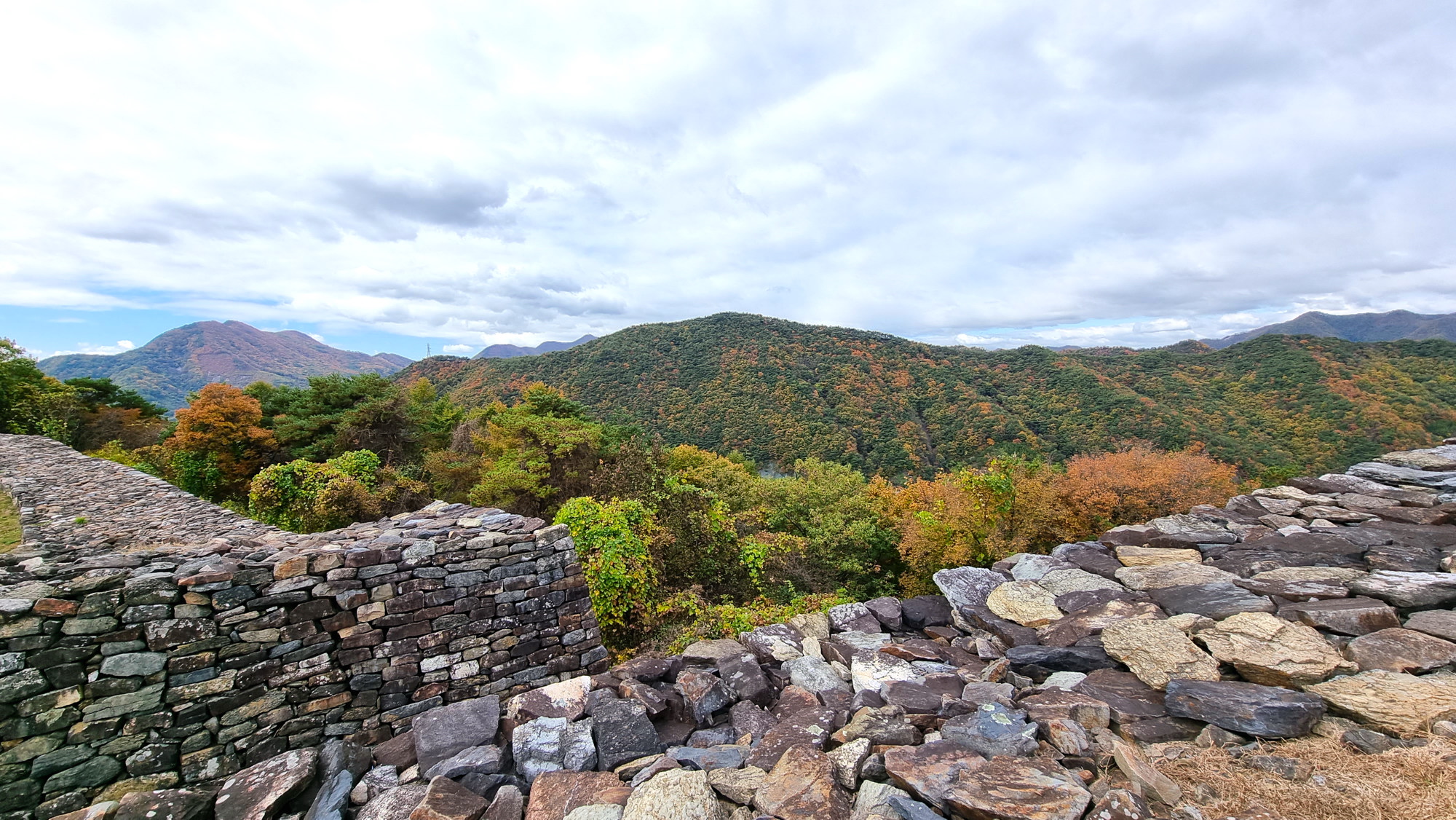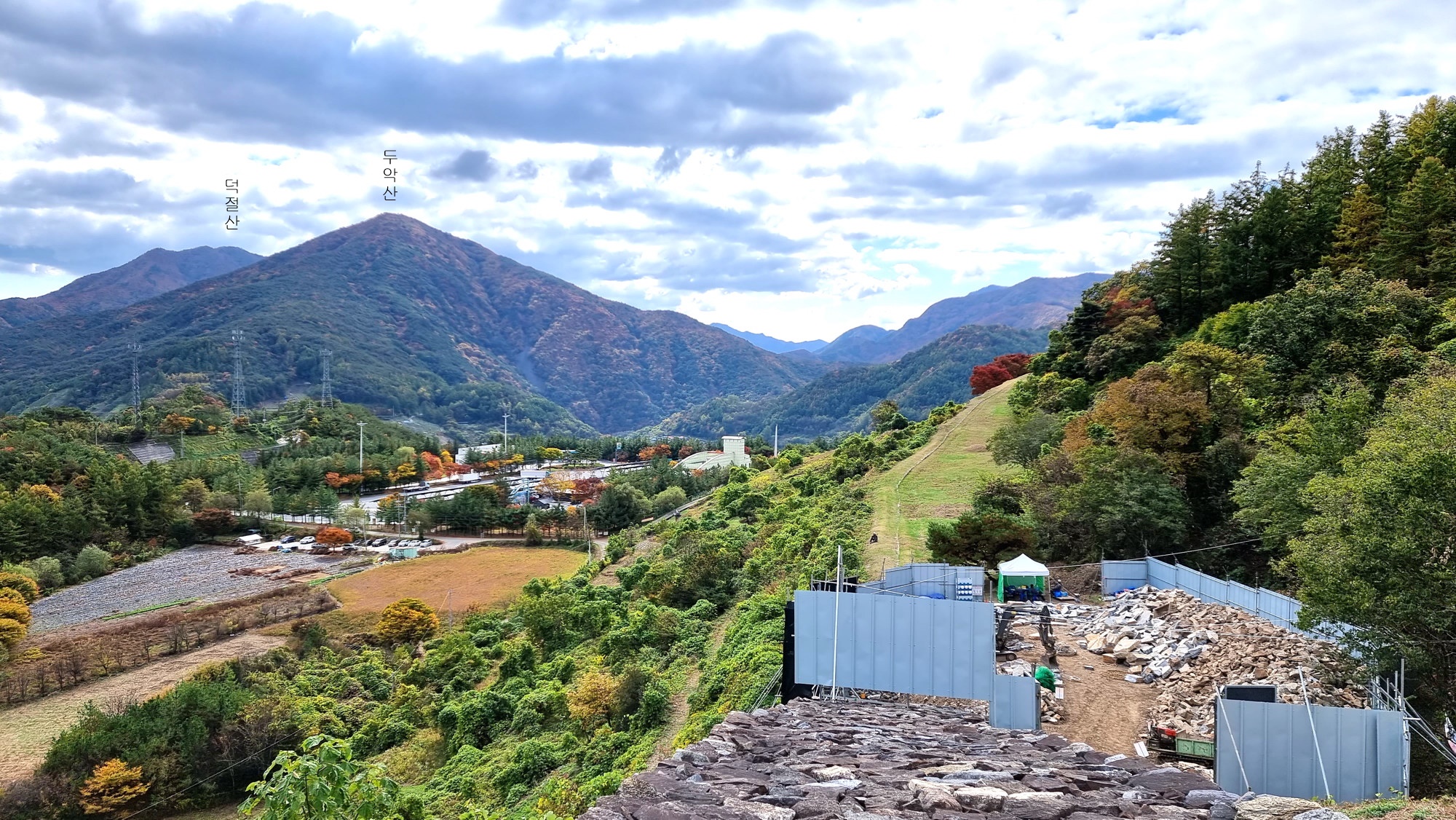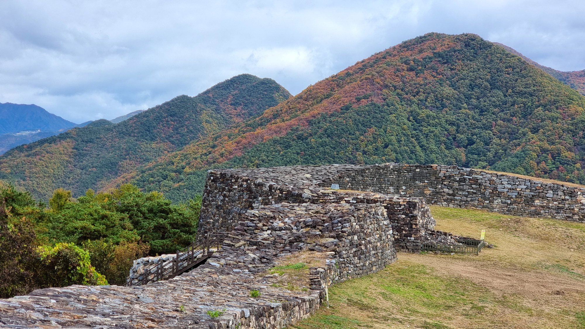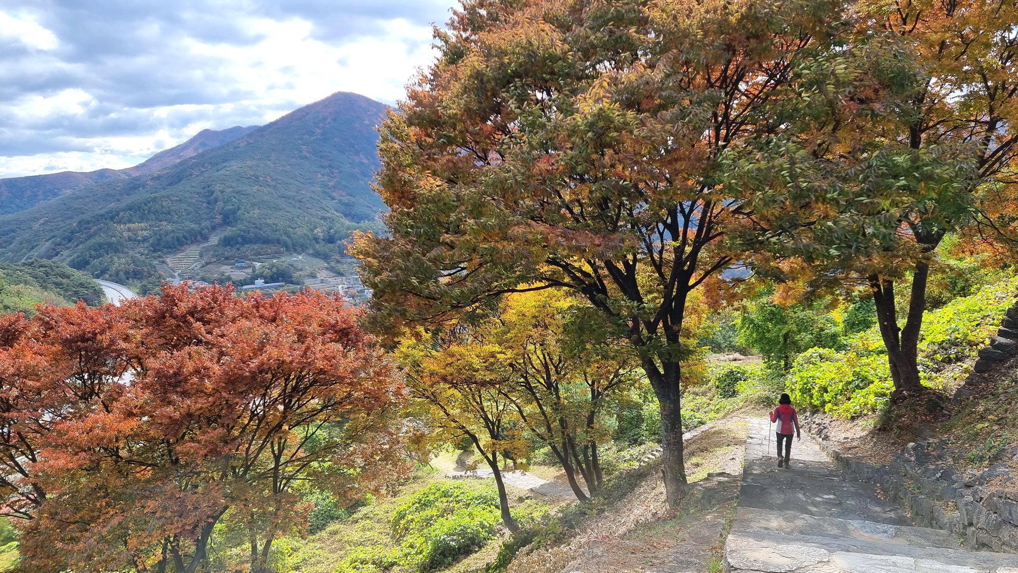 4. 코스 : 주차장( 단양군 단성면 하방리 52 / 중앙고속도로 단양팔경휴게소 춘천방향 인접)~도로갈림길 좌틀~철망펜스따라 가다 갈림길에서 우틀, 이정목(단양신라적성비 방향)~비각~능선삼거리 쉼터에서 사각정자 왕복 후 적성산성 방향으로~적성산성~복원 끝지점에서 평탄한 길~적성안내표지~주차장