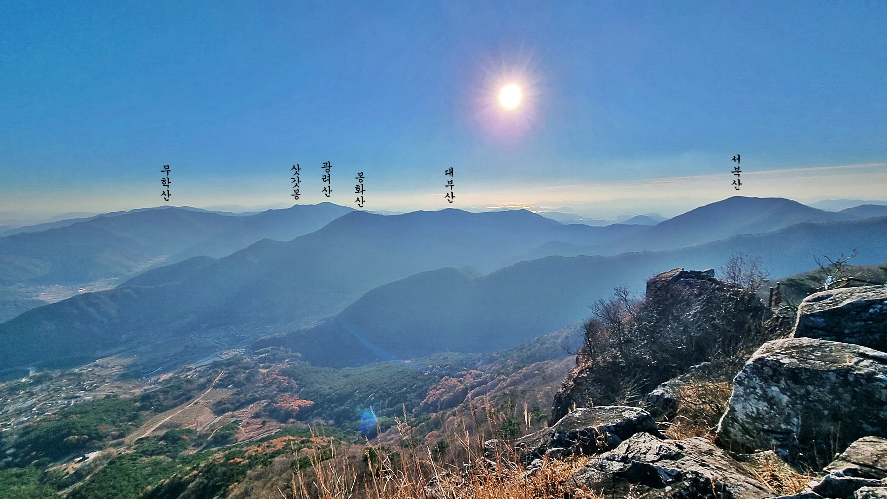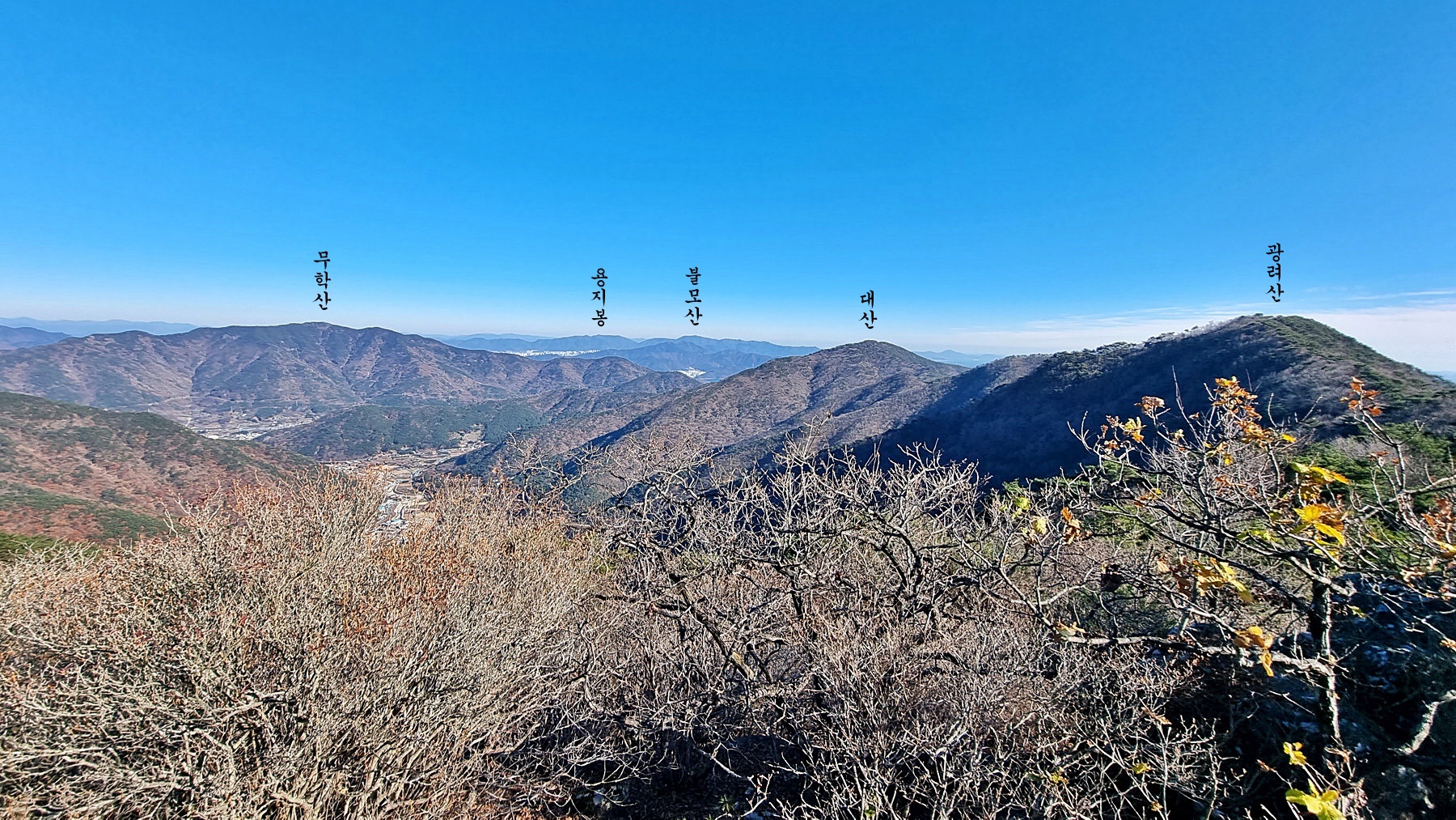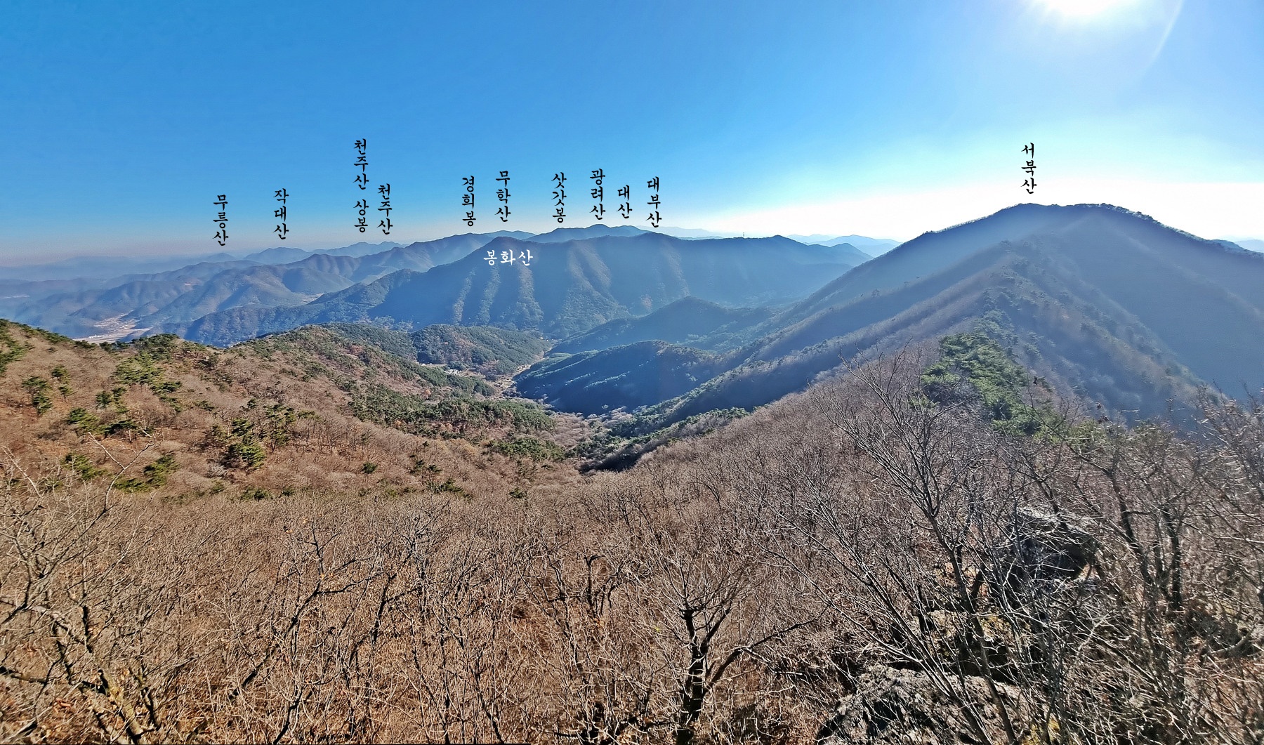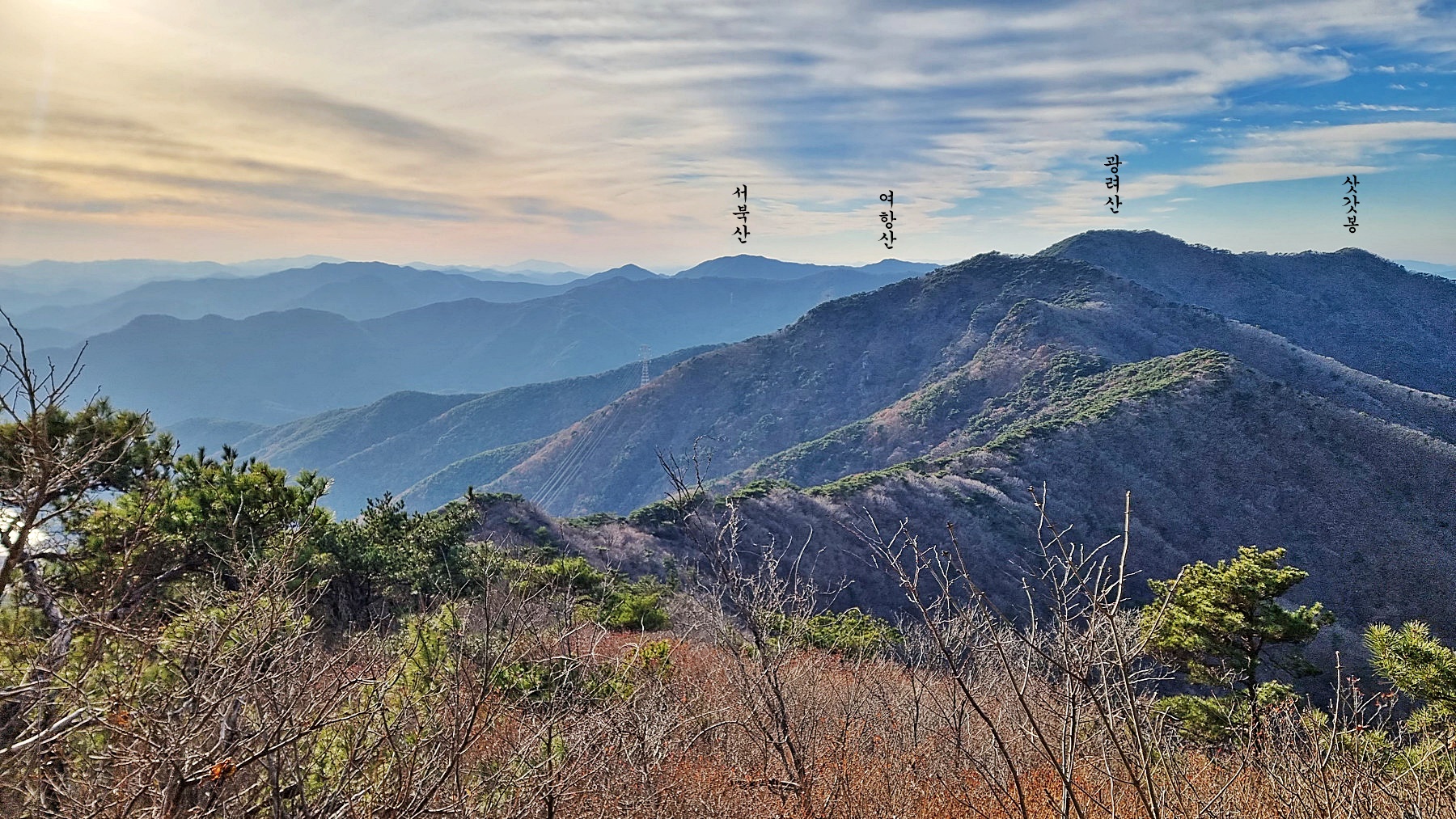 4. 코스 : 오곡재(비실재) ~ 미산령 ~ 미산봉 ~ 여항산 ~ 소무덤봉 ~ 서북산 ~ 감재고개 ~ 대부산 ~한치 ~ 삿갓봉 ~ 광려산 ~ 대산 ~ 윗바람재봉 ~ 바람재 ~ 쌀재고개