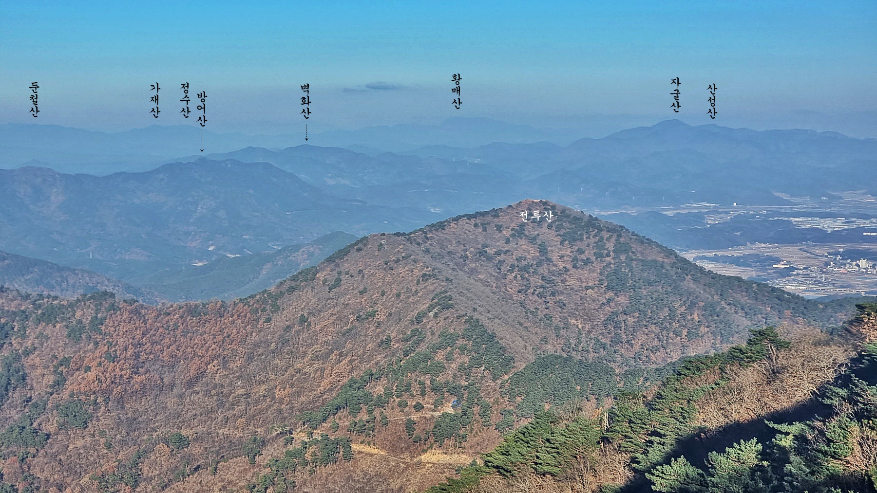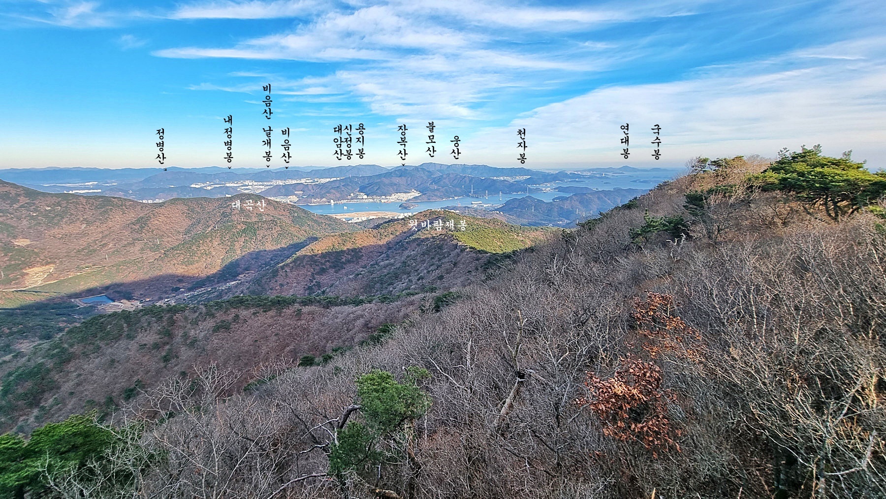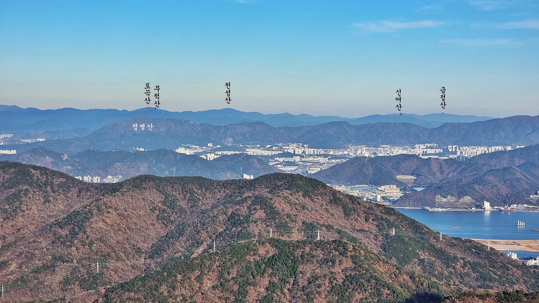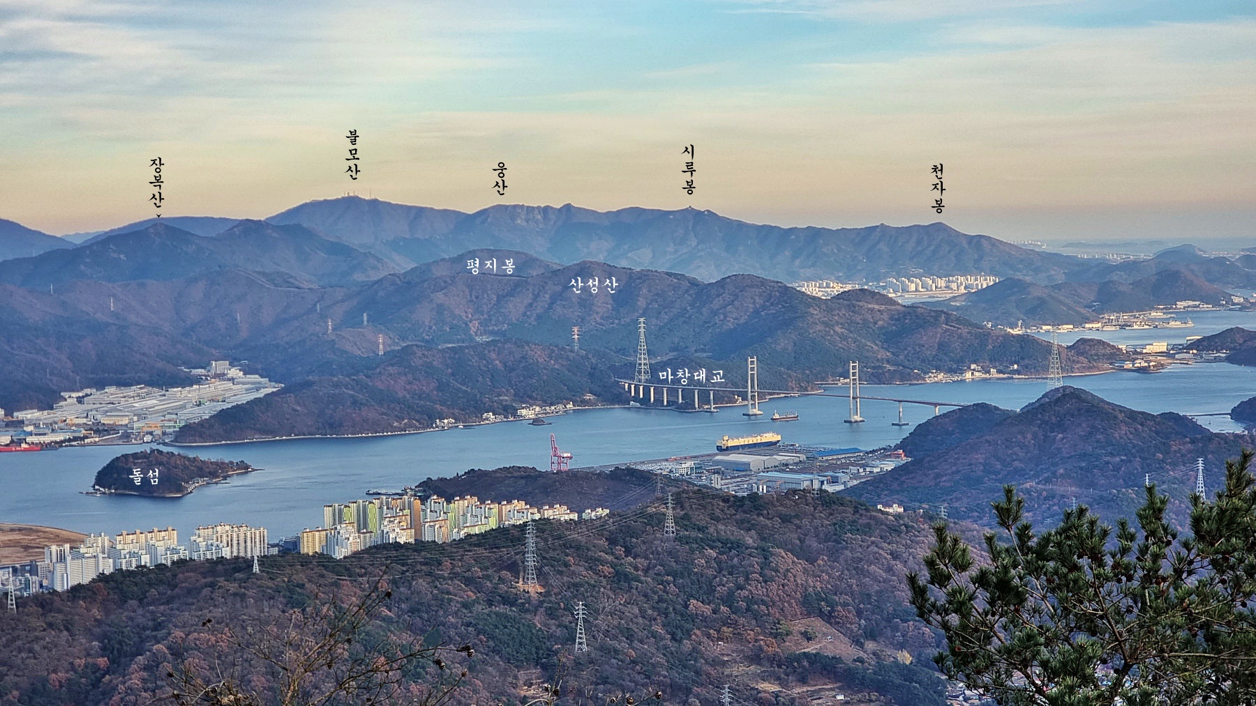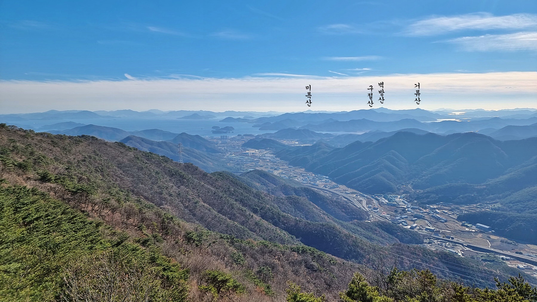 ▼광산먼등,윗바람재봉을 지나면서 마창대교 건너 진해의 명산 장복산, 웅산 등을 조망하고
