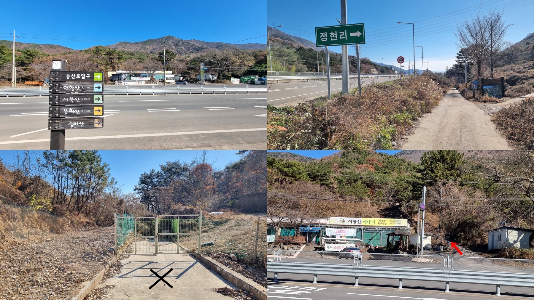 ▼ 왕복 4차로 건너편 여항산미나리 식당으로 가야 하는데 좌우를 살펴봐도 근처에 횡단보도가 없고 이정목 방향으로 조금 진행해보지만 도로를 건너갈 통로가 보이지 않아 되돌아와 부득이 위험을 감수하고 2단으로 설치된 중앙분리대를 타고 넘었고