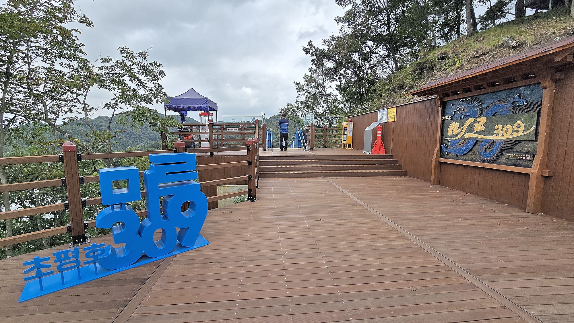 ▼ 정자에서 먹뱅이산 방면 조망. 중앙 하늘다리, 우측 미르 309 출렁다리